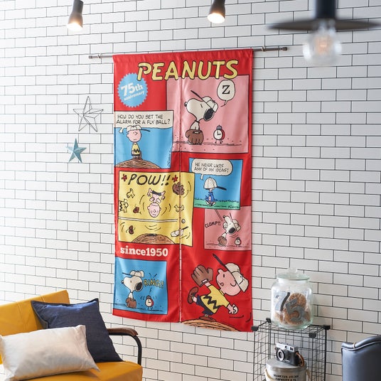 「レトロアメリカン」を思わせる明るくカラフルなデザインで、コミックのワンシーンを描いたイラストが特徴ののれんです。赤を基調にした色使いで、飾るだけで楽しい雰囲気を演出します。約85×150cm、約85×180cmの2サイズを展開しているので、使用場所に合わせて選ぶことができます。