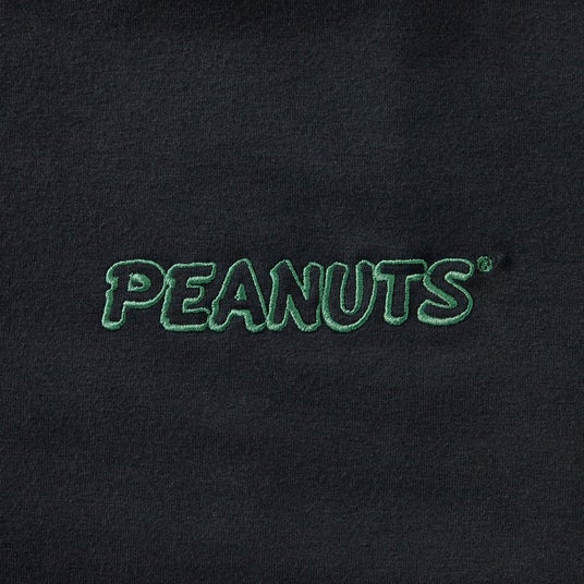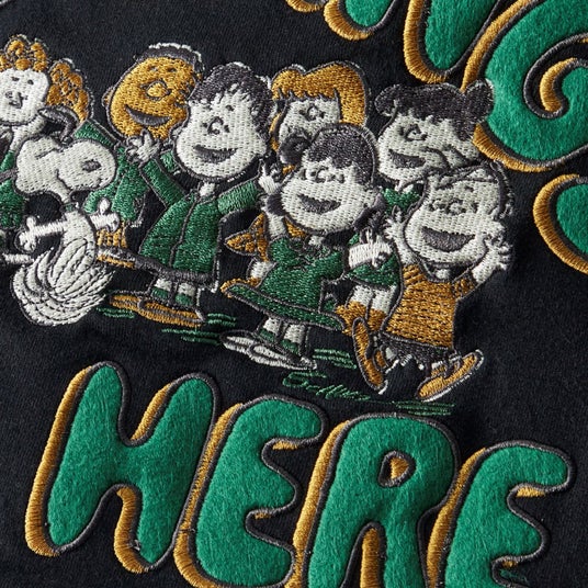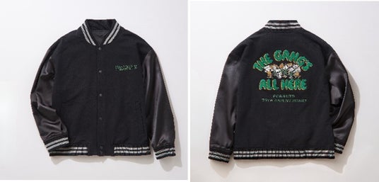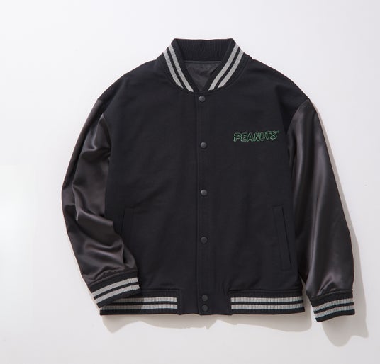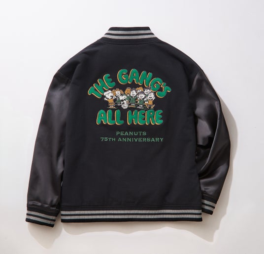 背中にPEANUTSの仲間たちが集合したベルメゾンオリジナルの75周年記念アートデザインのスタジャンです。ブラックを基調とした生地に、グリーンの立体感がある刺繍がポイントの商品です。身頃の生地には厚みのある裏毛素材を使用し、袖は光沢感のあるサテン生地を使用しています。内側全面に裏地が付いているので、袖通りがスムーズです。