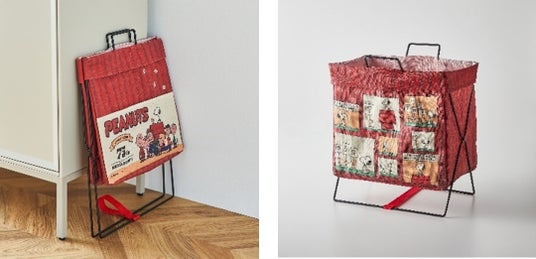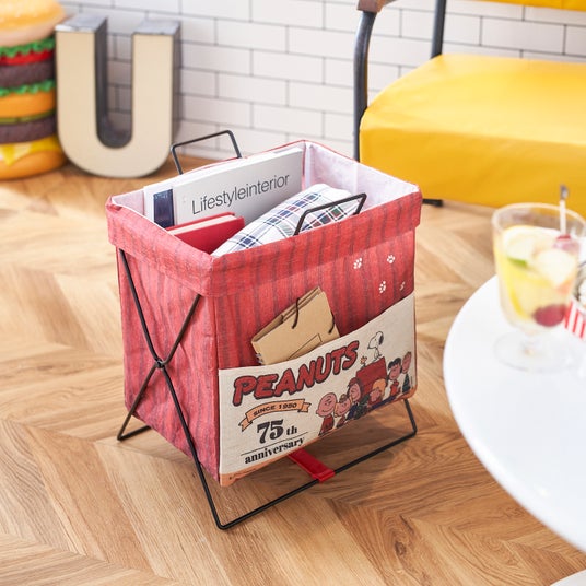 コミックのワンシーンと、ピーナッツの仲間たちのデザインが描かれた収納スタンドバスケットです。