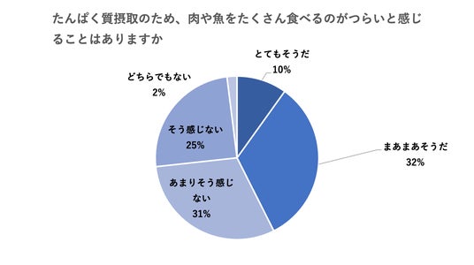 年齢を重ねると胃もたれなどの理由から、肉や魚などの動物性たんぱく質を避ける人が多いと想定していたものの、実際は約半数以上の人が「(たくさん食べることをつらいと)感じない」と回答。