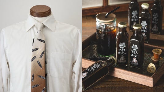 コレクションのラインナップには、大阪・千日前に本店を構える「丸福珈琲店」とのコラボレーションアイテムも加わります。丸福珈琲店は、2025年に創業90周年を迎える老舗喫茶店。2023年の父の日に、直営店での共同企画を行った縁で、90周年の記念アイテムとして、丸福珈琲店のアイコニックなアイテムをデザインに落とし込んだ2種類のネクタイを制作。