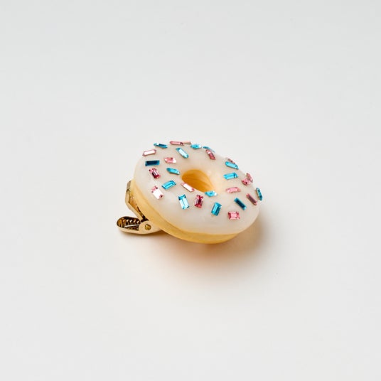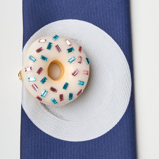 ドーナツのネクタイピンがポイントの「TREAT MEタイ(フレンチクルーラー)」「TREAT MEタイ(ドーナツ)」。テーブルクロスの上のお皿が織りで胸元に表現されたネクタイに、おいしそうなドーナツのネクタイピンを着けて、セットでお楽しみいただけます。