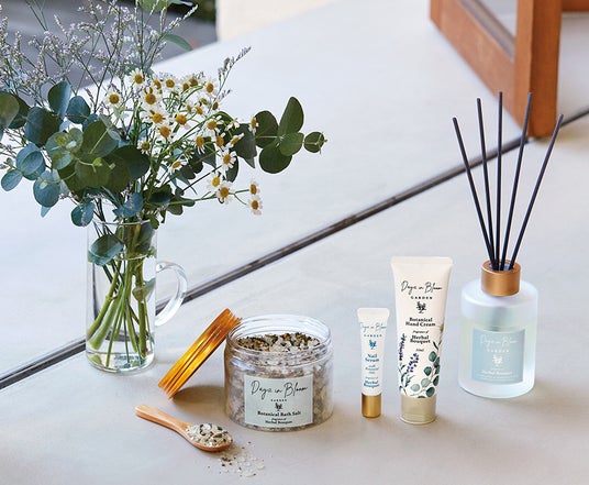 左からバスソルトジャー、ネイルセラム、ボタニカルハンドクリーム、リードディフューザー