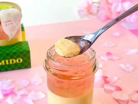 国産桜を使用した桜ジュレを旬実堂プリンと一緒に。春の香りをとじ込めました。