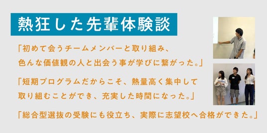 高校生にとっては、高い志を共有する同世代の仲間ができるだけでなく、大学生と出会い、自分の将来を見据えたロールモデルを発見できる世代を超えた仲間ができます。社会の既成の枠の限界に真正面からぶつかろうとする気持ちに火をつけていくコミュニティでもあります。