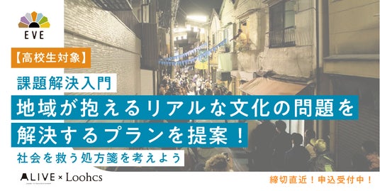 総合型選抜・AO入試専門塾のルークス志塾を運営するLoohcs株式会社(代表取締役 :嶺井 祐輝 以下「ルークス」)と、日本最大級の異業種混合型リーダーシップ開発プロジェクトを提供する一般社団法人ALIVE(代表理事:庄司 弥寿彦、以下「ALIVE」)は、社会課題をテーマに、高校生・大学生が協働して、課題解決を通じて学び、その後の人生について火をつけるプロジェクト「EVE(イブ)」の募集を開始します。