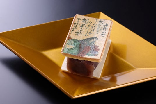 甘味には、大津市で60年以上の歴史を持つ和菓子の名店「叶 匠壽庵」の『あも歌留多』を。近江神宮所蔵の百人一首絵札を色鮮やかに表現しています。滋賀県産のもち米"滋賀羽二重もち"を使ったサクサクの最中種に、ふっくら艶やかなつぶ餡と、柔らかい餅の菓子『あも』を挟んでいただきます。どの歌になるかは当日のお楽しみです。