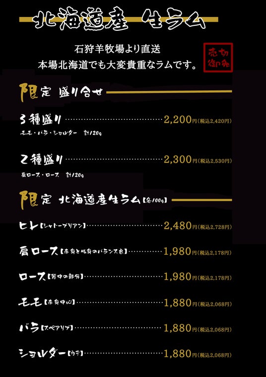 現在、国内産のラム肉の流通量は1%未満とされています。北海道で消費されるジンギスカンやラムしゃぶの多くは、オーストラリアやニュージーランドなどの輸入品です。北海道産の羊肉は希少価値が高く、国内で提供している店舗は限られております。当店では、北海道の石狩ひつじ牧場様及び秋田県の宮の羊牧場様と契約を結び、国内産の生ラム(生後1年未満)を毎月1頭の割合で入荷しております。上記の国内産ラムに加え、ラム肉の国内輸入量が1%未満の大変貴重なアイスランド産ラムもご提供しております。また、北海道産の厳選されたワインや日本酒も取り揃え、関東に居ながらも北海道の魅力を感じられるお店を目指しております。