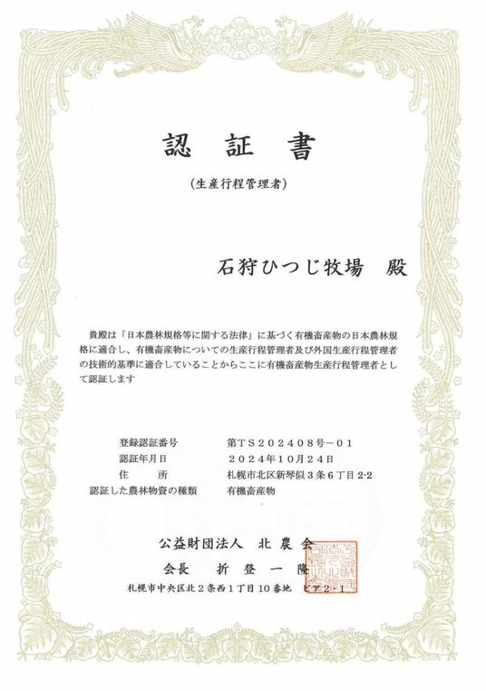 さらに、石狩ひつじ牧場の羊肉がJAS有機畜産物として認証されました! 5月1日から10月31日まで、石狩川の河川敷で放牧して育てた羊がオーガニック羊肉として認められました。多大な時間と資金を投入し、良い結果を得ることができました。国土交通省の取り組みにより、除草費用がゼロになり、消費者はより安全な羊肉を享受できる画期的な方法となりました。ご支援、ありがとうございました。