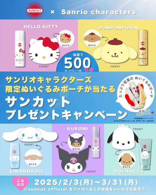 また2月3日より、サンリオキャラクターズとコラボレーションをしたSNSプレゼントキャンペーンを実施いたします。InstagramとXで実施し、抽選で合計500名様にサンカット(R)限定パッケージとサンリオキャラクターズ限定ぬいぐるみポーチのセットが当たるキャンペーンです。限定ぬいぐるみポーチは、たっぷり大容量で裏面が日やけバージョンのスペシャル仕様となっております。