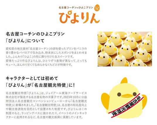 ジェイアール東海フードサービス株式会社(本社:愛知県名古屋市、代表取締役社長:岩下賢一)のオリジナルスイーツで、名古屋観光特使に任命されている「ぴよりん」が、Hisaya-odori Parkで開催されるイベント「HISAYA Walkin' in a WINTER WONDERLAND」と初コラボレーション!