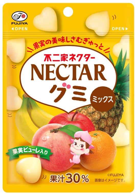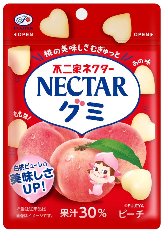 1964年に発売した不二家のロングセラー飲料「ネクター」。桃をまるごと裏ごししたピューレを使用した、濃厚でまろやかな味わいが特長です。今年は、ネクターのおいしさをぎゅっと詰め込んだ、可愛いもも型の「ネクターグミ(ピーチ)」がより美味しくなって新登場。さらに新商品2品を同時発売し、ネクターグミシリーズとして展開を拡大します。