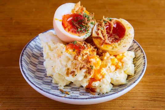 鳥たんこだわりの味付け!半熟煮玉子ポテサラフライドオニオンのサクサク感と、ブランド卵である「赤玉頑固」を使ったこだわりの一品。
