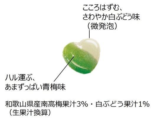 ・キャンディの味わいは、あまずっぱい青梅とさわやかな白ぶどうの2種類の味わいが1粒で同時に楽しめます。