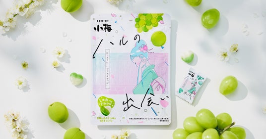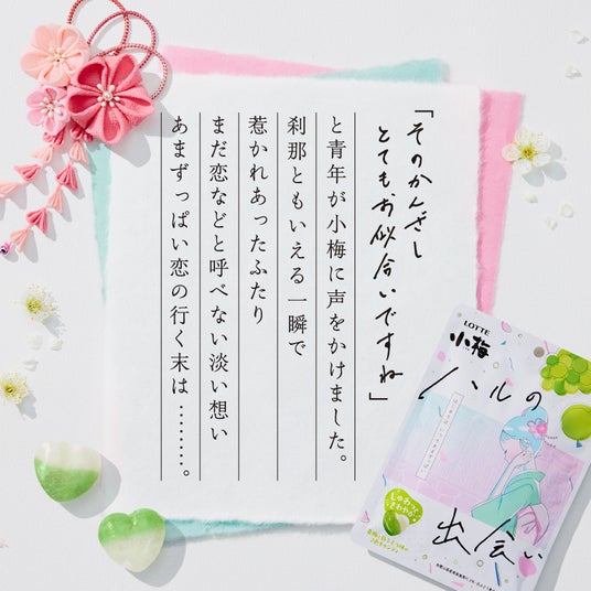 2024年に発売から50周年を迎えた小梅。「小梅 ハルの出会い」は小梅ちゃんの初恋物語のワンシーンを切り取ったパッケージと、そこに吹く春一番をイメージした、あまずっぱいキャンディです。裏面の2次元コードから「小梅の初恋すとおりい」を読むことができます。この小梅を食べながら、初恋物語を読んで、身も心もあまずっぱくなる・・・そんな今までにない新しい体験をぜひお楽しみください。