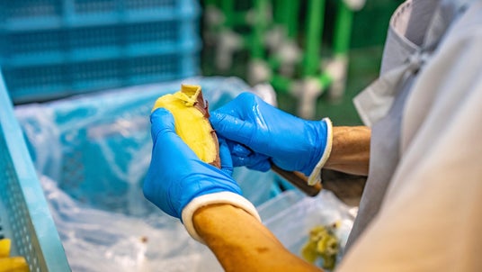 熟成を終えた「紅はるか」は、大型蒸し焼き機で30~50分じっくり蒸します。この時間調整が、芋の甘さと食感を最大限に引き出すポイントです。蒸し上がった芋は、全て手作業で皮を剥きながら品質をチェックします。見た目や状態を一つずつ確認することで、最上級の干し芋に仕上げています。スライスした芋は専用の乾燥機に入れて、約12時間乾燥させます。しっとりとやわらかい食感になるよう水分量を細かく調整しています。
