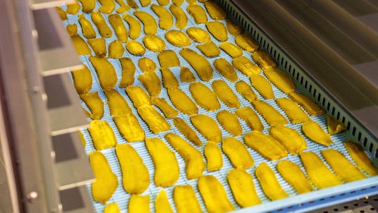 熟練職人によるスライス加工では、蒸し上がり直後の繊細な芋を1cm幅に均一にカット。乾燥工程では、12時間かけて水分量を調整し、しっとり感を保ちながら0.5cmの厚さに仕上げています。