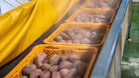 コーセンの「干し芋」は、甘さとしっとり感が特徴の「紅はるか」を使用しています。この品種は、干し芋や焼き芋に最適で、収穫後はすぐに加工せず、専用貯蔵庫でじっくり熟成させます。収穫直後の糖度は8度程度ですが、熟成させることで13度以上に引き上がり、最高の状態で加工を始めています。