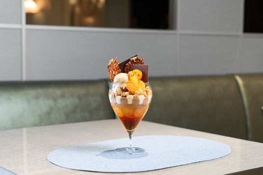 アルマーニ / カフェ 表参道の人気メニュー、月替わりのパフェ。2月はバレンタインシーズンにふさわしい、チョコレートと金柑、爽やかな柚子の絶妙なハーモニーを楽しめる特別なパフェをご用意しました。厳選した贅沢な食材を使用し、甘さと酸味のバランスがとれた仕上がりで、大切な人との心温まるひとときを演出します。