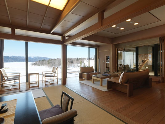 鶴雅グループが展開するエグゼクティブクラス"座"シリーズの1つ「あかん鶴雅別荘 鄙の座」は、全室に露天風呂が付いたゆとりある設えのスイートルームをそなえた高級旅館。客室からは目の前に広がる阿寒湖と雄大な大自然の景色を楽しむことができます。お食事は北海道の旬の味覚と新鮮な素材にこだわる和食会席をご堪能いただけます。また、夕食時やバーラウンジ、客室冷蔵庫内など、滞在中の飲み物は一部特別なものを除き、全て無料でのご利用が可能です。