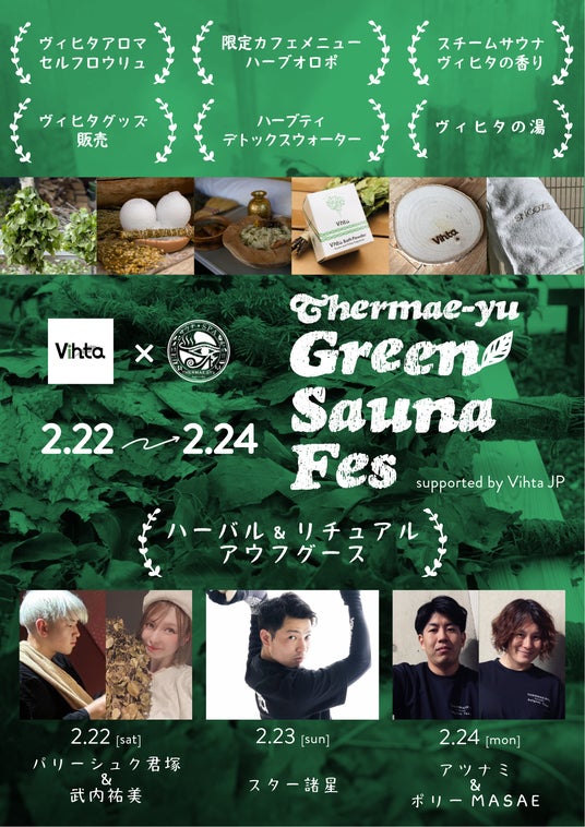 株式会社エレナが運営する温浴施設「テルマー湯西麻布(港区西麻布、https://nishiazabu-thermae-yu.jp/」が、サウナ内で使用する白樺の葉や木の枝を束ねた"ヴィヒタ"を販売する「Vihta JP(https://www.vihtajapan.com/)」全面協力のもと、サウナイベント『Green Sauna Fes(グリーン サウナ フェス)』を開催する。