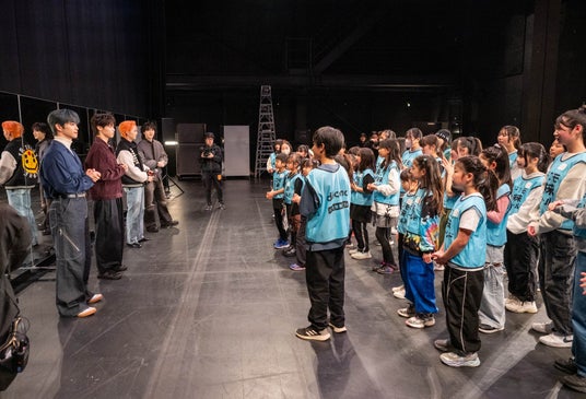 ダンス未経験者も多く、最初はぎこちなかった子どもたちも、レッスンが進むと徐々に音楽に乗りながら楽しそうに踊れるようになりました。するとそこに、JO1の川尻蓮さんと豆原一成さん、INIの木村柾哉さん、後藤威尊さんがサプライズ登場!これから本番を控えるアーティストの登場に、子どもたちからは歓声が上がりました。