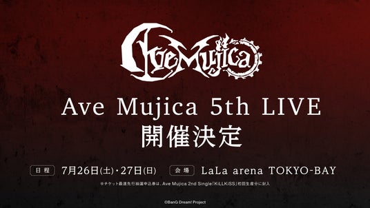 7月26日(土)・27日(日)に、LaLa arena TOKYO-BAYにてAve Mujica 5th LIVEの2DAYS開催が決定しました。チケット抽選受付の詳細は今後の発表をお待ちください。