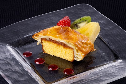 ◇カステラのキャラメルパイ包み◇ふんわりとしたカステラに、さくさくのパイ、カリッとしたくるみ。様々な食感のハーモニーを楽しめる一皿。
