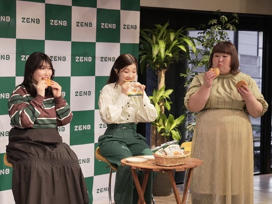 株式会社ZENB JAPAN(ゼンブ ジャパン)(愛知県半田市、以下ZENB)は、グルテンフリーのまるごと豆粉パンの新フレーバー「ZENBブレッド きなこあん」の発売を記念して、発売当日の2025年1月29日(水)に新商品発表会を開催しました。午前の部では、人気お笑いトリオ「3時のヒロイン」、午後の部では、腸活ブームの火付け役である加治ひとみさん、サウナの聖地「しきじ」の娘で美容家の笹野美紀恵さんらが登壇しました。