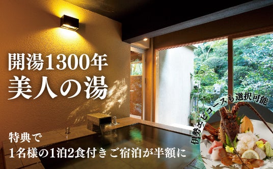 一口につき、2名以上で宿泊の場合に限り、お一人様分の1泊2食付き料金を半額(最大29,500円相当/消費税込・入湯税別途)