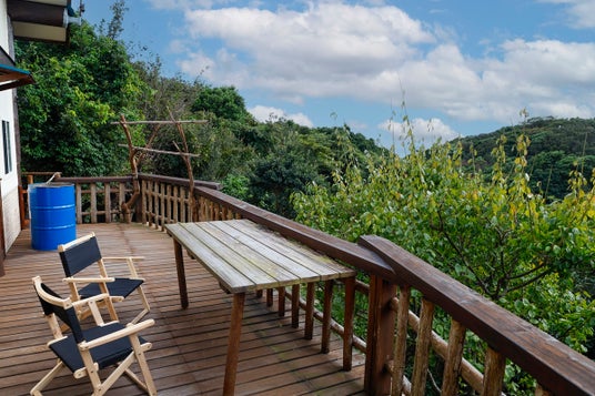 厳選された木材を使用し、地元職人の手によって丁寧に作り上げられたログハウスで、どこか懐かしさを感じさせるクラッシックな外観となっています。建物の前には梅の木や菜園があり、宿泊者は摘み取りをすることも可能です。広々としたウッドデッキもあり、ワンちゃんと一緒に景色を眺め、リラックスして過ごすことができます。