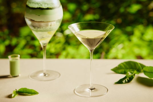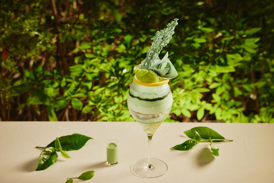 パフェをさらに楽しめるよう、新茶「大井わせ」を使ったオリジナルカクテルも用意します。大井わせの瑞々しい香りが引き立つよう、爽快感のあるジンやハーブリキュールと合わせました。爽やかな味わいを楽しめるカクテルは、新茶を使ったムースの甘みや柑橘の入ったゼリーの酸味と相性抜群です。