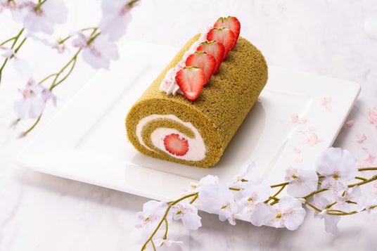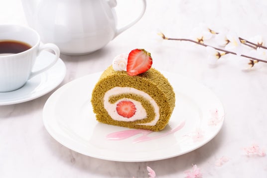 やさしい甘さの白あんとほんのり桜が香るクリームを、ふわふわの抹茶の生地で包んだ「和」のロールケーキです。甘酸っぱい苺もアクセントとなり、春のカフェタイムを彩ります。また、このロールケーキは「苺と桜のアフタヌーンティーセット」にもラインナップしています。