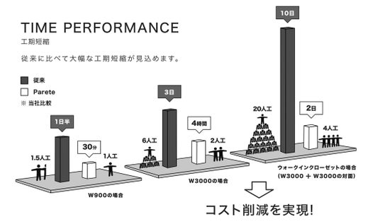 造作家具の設置には多大なコストと時間を要します。もしその工程を省くことができれば、理想の空間づくりがさらにスムーズになるのではないでしょうか。高い意匠性を持ち、手軽に時間を短縮できるPareteなら実現できます。