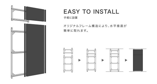 弊社が開発したオリジナルフレーム構造により、水平垂直が簡単に取れるだけでなく上下のアジャスターを調整するだけで、従来の取付設置にかかる時間を大幅に短縮し作業がスムーズに行えるようになります。また、工期短縮が見込めることで施工にかかるコスト削減が実現します。