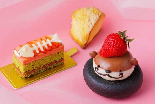イチゴの食べ比べには、奈良県産の「古都華」と近鉄百貨店直営はるちかファームで栽培した「はるかすまいる」をご用意し、それぞれの味・香りの違いを感じていただけます。可愛いカワウソのプティガトーや茶筅に見立てたマカロンなど、パティシエの細かなこだわりもご一緒に楽しんでお召し上がりください。