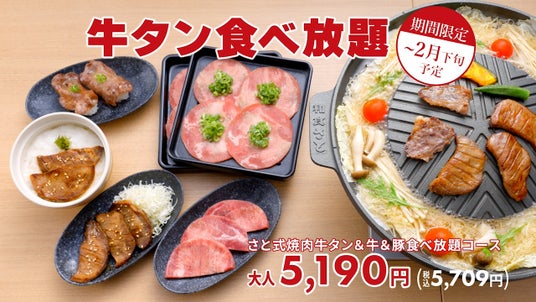 国内197店舗を展開する「和食さと」では、人気の食べ放題「さとしゃぶ・さとすき・さと式焼肉」に、なんと「牛タン」が食べ放題の特別コースを期間限定で販売します。「牛タン食べ放題」は昨年の販売からご好評を頂いている人気のコースで、今回、食べ放題となる牛タン料理を新たに加え、パワーアップして帰ってきました!オススメのさと式焼肉の牛タン食べ放題コースでは、程よい歯応えと牛タンの旨みを存分に楽しめる焼肉専用の「厚切り牛タン(特製たれ/旨塩だれ)」が食べ放題です♪もちろん焼いてもタンしゃぶにもピッタリの牛タンスライスや牛タンにぎりなども食べ放題で、さらに今回から「牛タンのユッケ風」「牛タンサラダ」「牛タン月見丼」も食べ放題に仲間入り!!そして、2月5日(水)から、和食さとアンバサダーの渋谷凪咲さんが出演する、牛タン食べ放題のTVCMも放送スタート♪是非、今だけの牛タン食べ放題コースをお楽しみください。