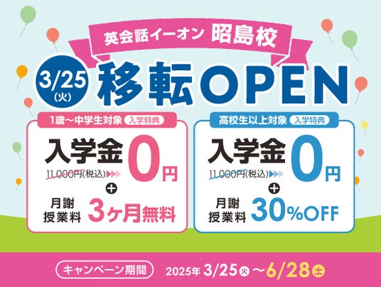 英会話教室を運営する株式会社イーオン(本社:東京都新宿区、代表取締役社長:重野卓、以下「イーオン」)は、2025年3月25日にイーオン昭島校を移転オープンいたします。