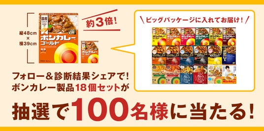 また、キャンペーン期間中に診断結果をXでシェアし応募いただいた方の中から、抽選で100名様に、「ボンカレー製品18個セット」をプレゼントいたします。実物の約3倍の、キャンペーン限定ビッグパッケージに入れてお届けします。