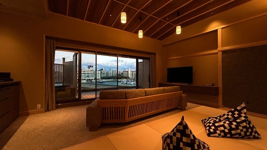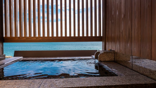 自分だけの専有温泉露天風呂が付いた4室のラグジュアリースイートは約100~200平米の広さを誇り、200平米超もの最大タイプの客室には、洲本温泉をなみなみと湛えた温泉露天風呂のほか、温泉水を使ったプライベートプールやサウナまで完備しています。
