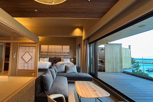 波打ち際のハイエンドヴィラ。淡路夢泉景に隣接し、眼前に渚が広がる開放的な敷地に約100~200平米の広さを誇る4室の温泉露天風呂付ラグジュアリースイートが新たにオープン。