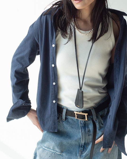 柔らかな本革を使用したロングベルトやキークロシェットは、ロングセラーの人気アイテム。今年らしい組み合わせにアップデートしたスタイリングも、今回のLOOKの見どころです。