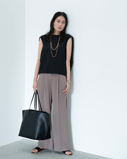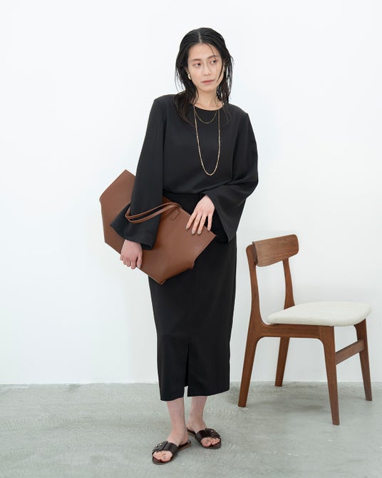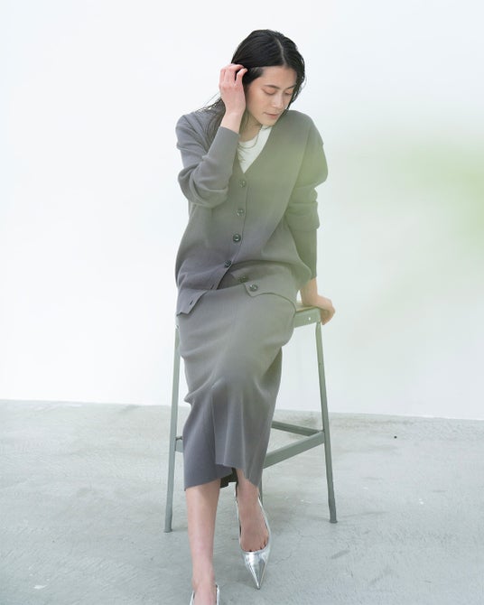 お客様の声にお応えして、セットアップで着られるシリーズを展開しています。大人が気になる身体の輪郭を上手にカバーしながら、美しいIラインシルエットをキープできるようにデザインしています。
