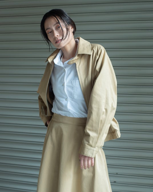 大人の女性が着こなせるスウィングトップブルゾンを提案。微光沢のある素材を採用し、ワーク感を抑えつつ、上品な印象に仕上げました。スカートにはサイドポケットを付けて、実用性をプラス。さらに、ウエストの後ろ部分にゴムを入れることで、快適な着心地にもこだわりました。