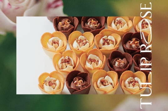 ラングドシャクッキーをわずか7秒でチューリップへと形作る独自の製法や、なめらかな口どけのままバラの形にクリームを絞る精巧な技術があって初めて可能になった、世界中で当店だけの一品です。