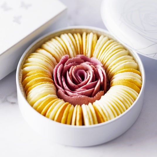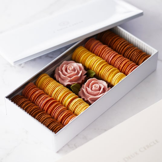 フランス産の素材を使用した、濃厚で味わい深いバラの形のチョコレートは華やかでパッと目を引く可愛らしさ。チョコレートとラングドシャの相性は抜群で、とろける2つの食感をお楽しみいただけます。
