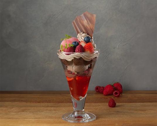 甘酸っぱい苺を合わせたベリージュレに、なめらかなショコラプリン、ショコラシャンティを絞り、砕いたフランボワーズを散りばめました。ビターでコク深いグラスショコラベネズエラ、さわやかな味わいのグラス苺&フランボワーズを重ね、ルタオで人気のチョコレート「ロイヤルモンターニュ」をコーティングしたフィアンティーヌをしのばせました。ショコラの深い味わいとベリーの酸味がマッチしたパフェです。