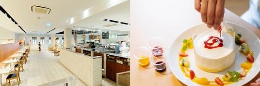 写真左:カフェコーナー、写真右:体験型スイーツ「ふわとろフロマージュスフレ~パトス~」