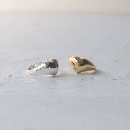 伝統的なシグネットリングの形状をオープンで柔らかなハートシルエットにアップデートしたリングコレクション。ハートは柔らかなカーブを描き、光の反射によって表情に変化をもたらせてくれ、着ける人の指を柔らかく包み込みます。