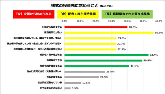 そんな"投資迷子"たちの投資先へのニーズとしては、【安】手軽に少額から投資できること、【金】配当金や株主への還元姿勢は当然重視しながらも、物品や金銭に近いポイントや割引のある株主優待といった直接的なメリットがあること、【長】長期保有できる優良な成長株への投資で安定して資産形成を図りたいという、若い世代の堅実な姿勢と"安・金・長"の投資傾向が読み取れます。